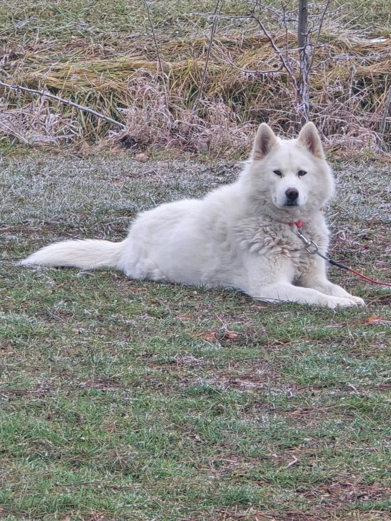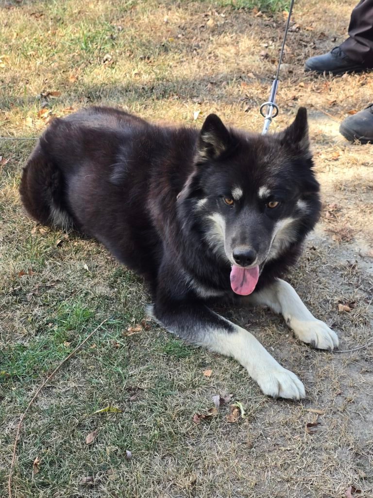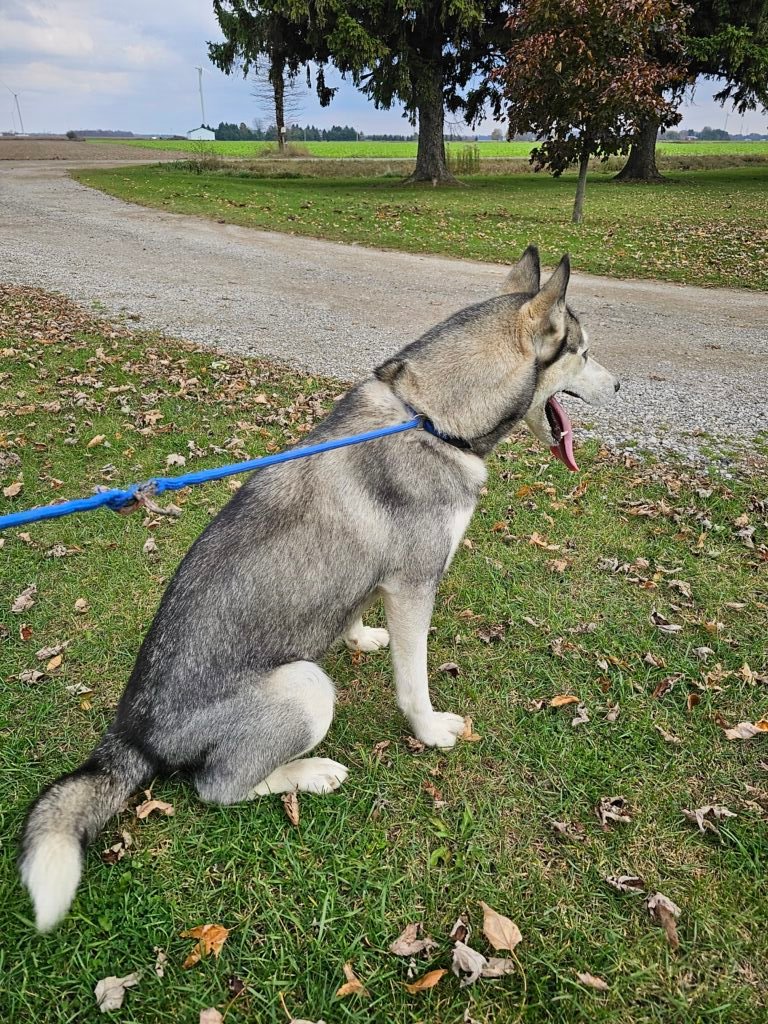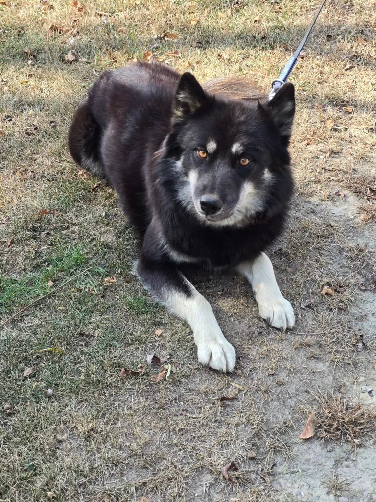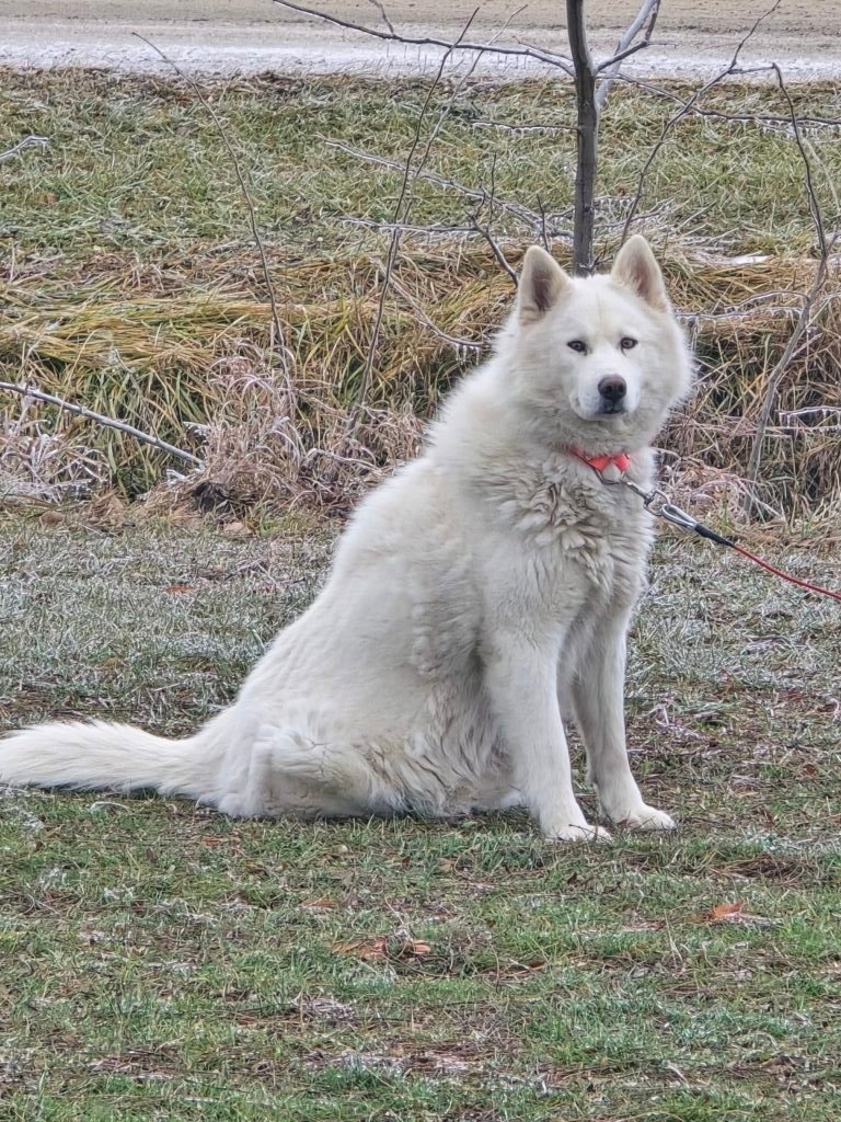 Meet Lyra! She is the daughter of Cinder and Oden. Born and raised here. Like her mother Cinder, she is a dominant female in our crew but you wouldnt know it with her size. She weights 42lbs.. She is due to have a litter March 2026. She is AKC registered